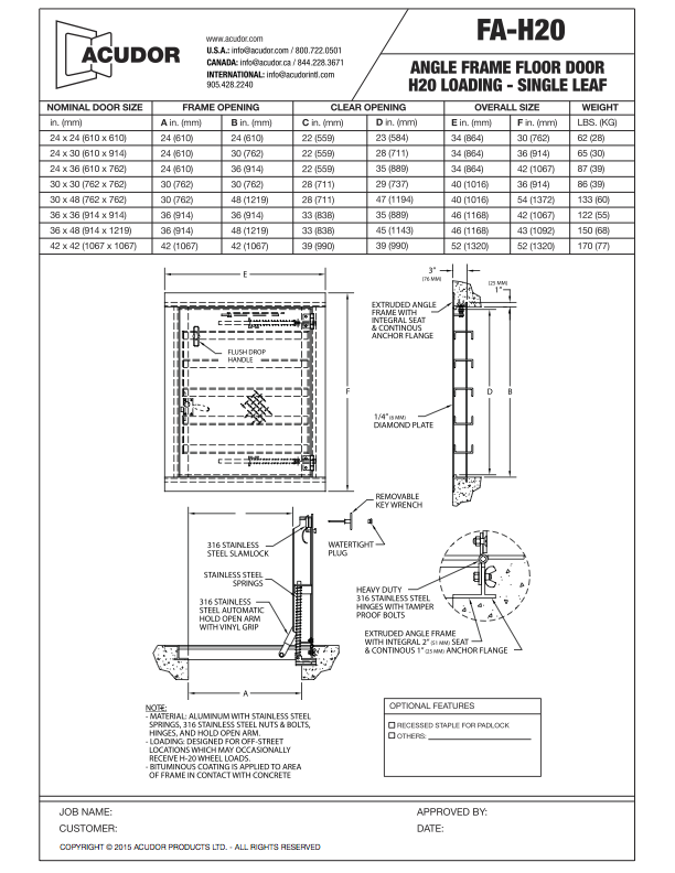 FA-H20 - Floor Door, H20 loadingDesigned for interior and exterior applications where watertightness IS NOT required